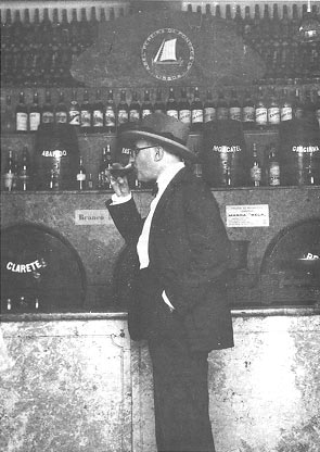 Esta fotografía, que envió Pessoa en septiembre de 1929 a Ophelia Queiroz con la dedicatoria «Fernando Pessoa, «en flagrante delitro«- así lo cuenta Jacques Bonnet en «Bibliotecas llenas de fantasmas» (Anagrama) -, volvió a tejer unos lazos que llevaban rotos nueve años y que iban a ceder, esta vez definitivamente, seis meses más tarde. Al menos, en su forma material. Ophelia no se casó nunca». Pessoa aparece bebiendo un vaso de vino tinto en la vinatería de Abel Ferreira da Fonseca, con unos pequeños toneles de Clarete, Afabado, Moscatel o Ginja detrás. Ya anciana, Ophelia narraba la anécdota entera: «Un día mi sobrino Carlos Queiroz trajo a casa la famosa fotografía de Fernando bebiendo vino. Llevaba una dedicatoria: «Carlos, éste soy yo, en el bar de Abel, es decir cerca del Paraíso terrenal, por otra parte ya perdido, Fernando, 2/9/1929″. Me pareció muy curiosa, desde luego – decia Ophelia -y le dije a mi sobrino que la quería para mí. Carlos se lo dijo y poco después me envió la misma foto con esta dedicatoria: «Fernando Pessoa, en flagrante delito». Le escribí para darle las gracias y me contestó«.