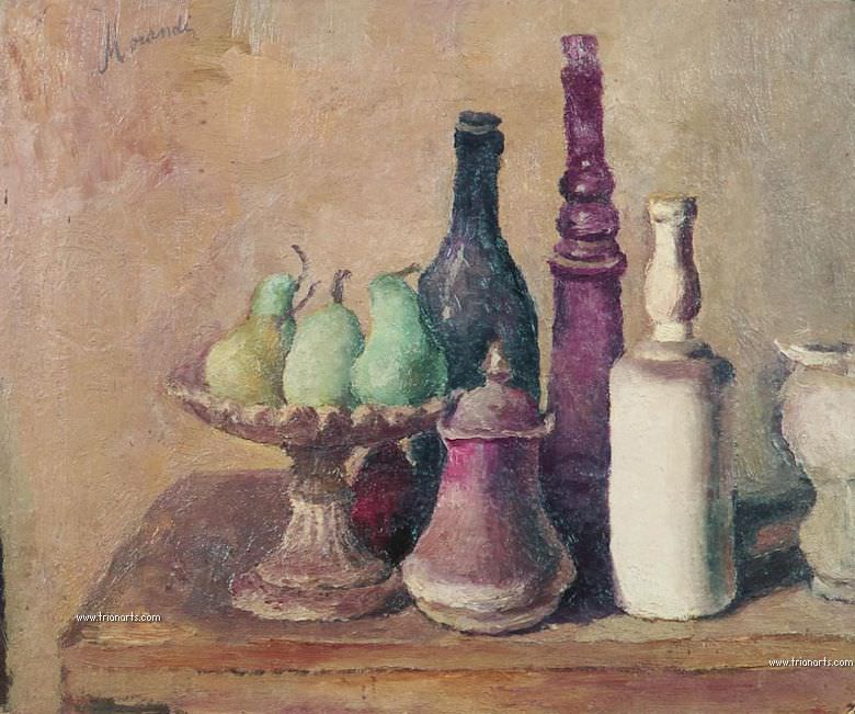 ‘En Morandi — decía Hughes— las cosas son distintas. Los objetos son intemporales: botellas lechosas de cuello largo y frascos cuadrados, una lata de galletas, unos cuantos jarros de metal de pico largo. No llevan marcas, dibujos o nombre de fábrica. Se piensa en ellos como en un titubeante esquema de arquitectura ideal. Algunas veces, los esbeltos cuellos de las botellas, dispuestas en conjunto, recuerdan vagamente las torres de Bolonia o San Gimignano. Parecen frágiles, pero perdurarán durante décadas, cuadro tras cuadro. La forma como están pintadas parece un poco torpe porque no hay concesiones a la prisa. Morandi raspaba más cuadros de los que acababa : su autocensura era implacable.Morandi ( que no se trasladó a ninguna parte mas que a un piso de Bolonia) no utilizaba atajos. Rechazaba las formas abreviadas y agudas. Los objetos se filtran deliberadamente en la atención del espectador. Poco a poco se ”desarrollan” en el ojo, y se comienza a captar sus relaciones internas.’