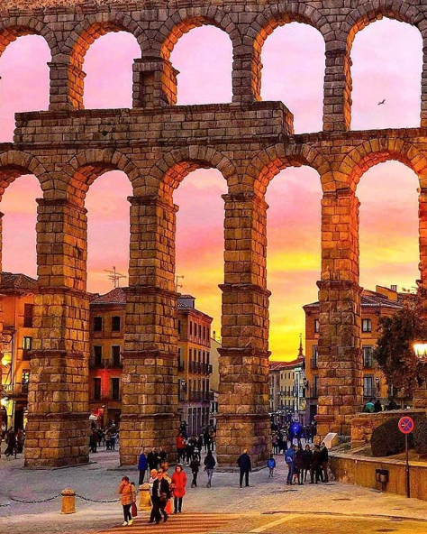 “Aquel aéreo puente de doble linea de ojos tan altos y multiplicados, invirtiendo el orden de costumbre — escribe José María Cuadrado sobre el Acueducto en sus ”Recuerdos y bellezas de España” — da paso al agua por el pretil y a los hombres y caballerías por lo más hondo del cauce. Desde arriba o desde abajo, por delante o por detrás, de frente o de soslayo, ofrece variadas perspectivas a cual más bella y original, mostrando al través de sus aberturas cual por los agujeros de un neorama cielo, calles, edificios, verdes paisajes, lejanos horizontes. Sobre su fantástico fondo resaltan cual si fueran monumentos las construcciones más vulgares; pero él campea y sobresale como el monumento por excelencia. Sencillez, elegancia, grandiosidad, se hermanan con admirable acuerdo en su perfecta estructura: la piedra, no traída de lejos, sino sacada del mismo suelo según indican las excavaciones, berroqueña, pulimentable, jaspeada con vetas negras, ha ido tomando un oscuro y venerable barniz sobre el cual se desliza tiempo hace la acción de los siglos