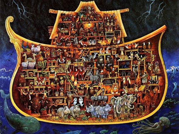 Cada ilustrador a través de los siglos ha ido poblando el Arca con su imaginación. Solo el cuervo que manda Noé y la paloma que recibe dejan en el cielo su realidad.