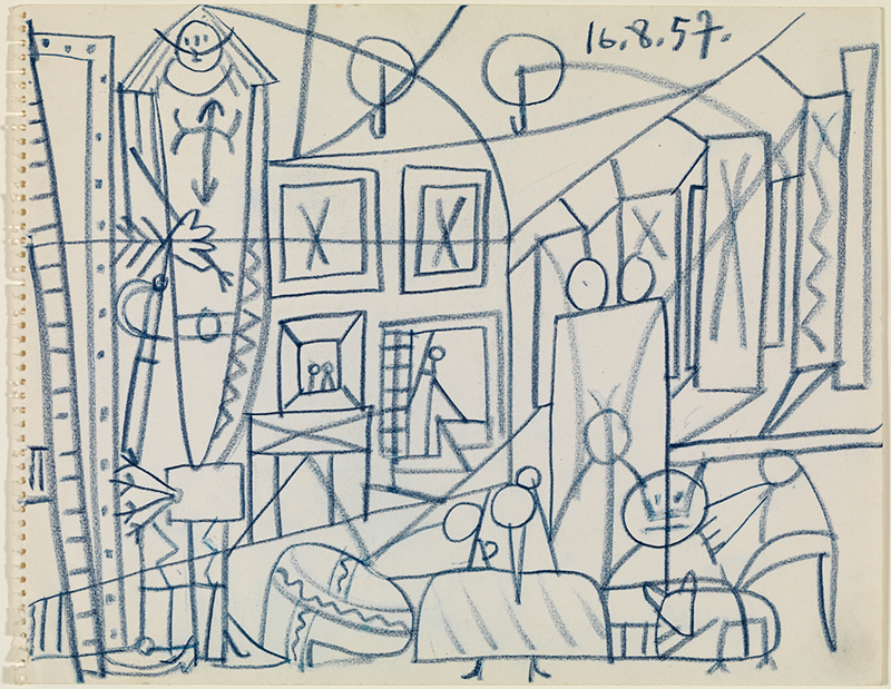 El vuelo de los pájaros— prosigue Sabartés— ha distraído a Picasso y a la vez le ha restablecido con el contacto entre su silencio interior y lo externo: el aire, la luz, la brisa marina vista al fondo, traen al “taller” la idea contraria al recogimiento. El 2 de diciembre, la presencia de Jacqueline sobre una tela confirma la hipótesis de que la vida ha vuelto al “taller”, el mundo exterior le ha invadido.Con el mes de diciembre, tan dulce en aquel ángulo de la Riviera, todo entra por el balcón. El año acaba con el último retrato de la Infanta Margarita, pintada por Picasso precisamente el 30 de diciembre de 1957.