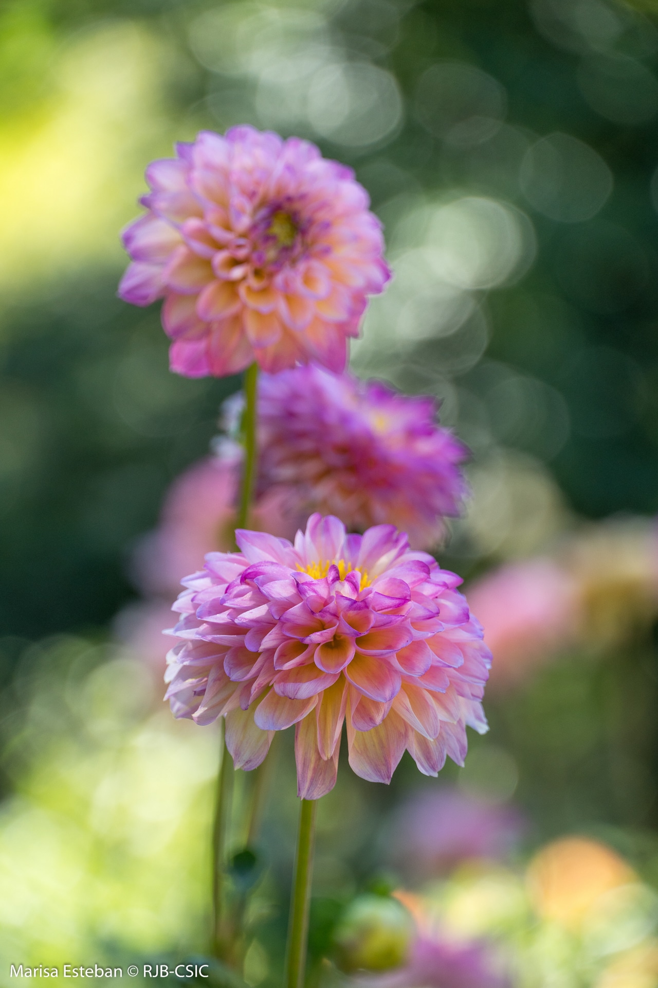 Las dalias, con sus hojas compuestas y opuestas, aparecen con sus flores reunidas, bastante grandes,de extrañas formas y presentando espléndidos colores