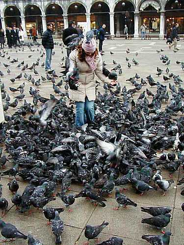 Si las entradas, en las ciudades famosas, quedan grabadas en la memoria, esta de Venecia bajo la tormenta salpicada de luces, misteriosa y obsesionante, será para mi inolvidable. Junto a ella, escenas, rincones, tiempos que brillan en Venecia como un fogonazo. Entré un día en San Marcos a las doce de la mañana. Los dos moros de bronce tocaban en ese instante las campanas. Escribir sobre la plaza de San Marcos …: a pesar de ello cada encuentro tiene un significado nuevo y cada ojo humano descubre un signo, sea original o repetido, que conserva todo su encanto. Creo que ha de penetrarse en San Marcos con el espíritu desnudo de turismo. La invasión turística ya se encargará de transmitirnos todo su eco mecánico, artificial y falso. Pero el centro de la belleza, el corazón de lo maravilloso y de lo insólito, debe llegarnos directamente, sin el obstáculo de las prevenciones, como un tiro de gracia: con sorpresa, como un disparo que lanza la belleza al cuerpo. San Marcos, nueva plaza para mi memoria, invadida, alborotada, orquestada por las palomas. Fomentan el turismo estas palomas de San Marcos. Caminan a pasos cortos; con sus patas rojas se amontonan, revolotean, se picotean breve y fieramente en una guerra intestina en busca de los granos de maíz. Es necesario levantar la mano a media altura y no bajarla, no arrodillarse: levantar la palma repleta de granos y sentir en la piel las puntas de estos picos que no hacen daño, que a una velocidad asombrosa devoran los copos sin fallar un solo golpe, con una voraz y consumada maestría. El rumor que acompaña a estos banquetes es únicamente el del aleteo, clásico aleteo registrado en las postales y en las películas: ese volar muy leve, como una onda, como un golpe de viento .