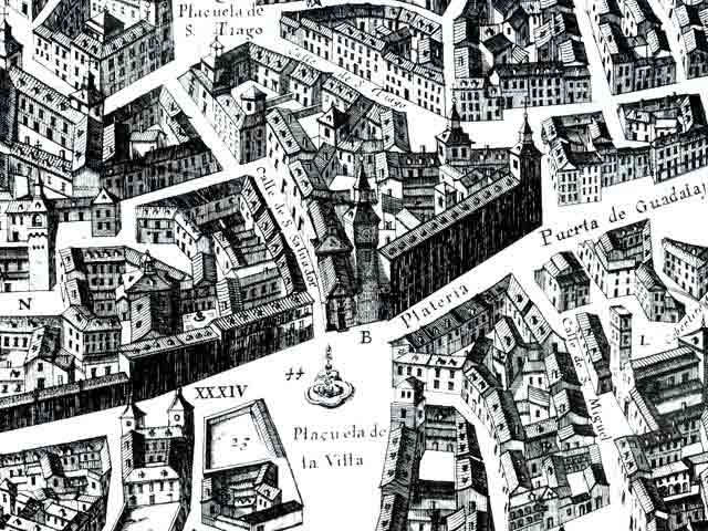 (Imágenes:-1.-Madrid a vista de pájaro.-calles alrededor de la Plaza de la Villa.-bing maps/2.-Plano de Texeira.-1656.-señalado con B se encontraba la iglesia del Salvador, donde Vélez de Guevara sitúa parte de la acción de «El Diablo cojuelo», hoy es el número 70 de la calle Mayor/3.-iglesia de Santa Cruz de Madrid)
