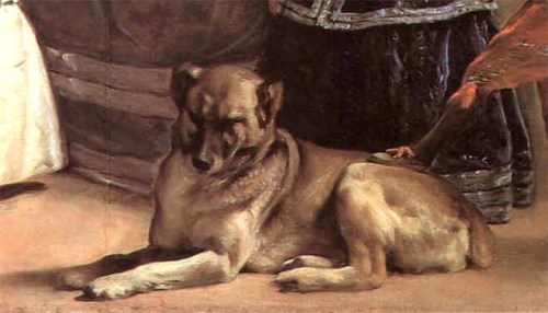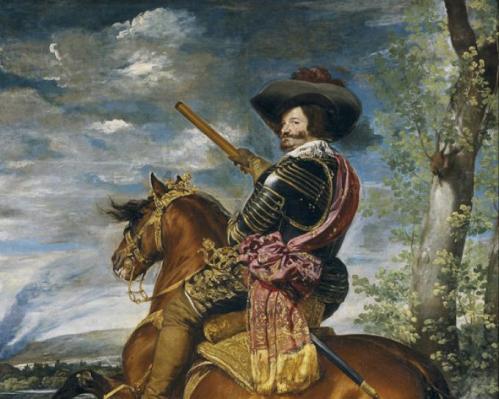 Se queda, pues, a la derecha de este guía del Prado que hoy es paciente del doctor, en término más distante y en media tinta, en lo profundo del cuadro, Doña Marcela de Ulloa, señora de honor, y junto a él, en sombras, un guardacamas, como entonces se llamaba a esta penumbra que el pintor revela. Muy al otro lado, a la izquierda, está el mismísimo Don Diego Velázquez, en apariencia inmóvil, pintando: tiene él la tabla de colores en su mano siniestra, y en la diestra el pincel, y la llave de la cámara y de Aposentador en la cinta, que no sólo lo dice Palomino, sino que personalmente yo lo vi, dice Ricardo Almeida, y eso lo admiran todos, don Pedro, así como el hábito de Santiago, que después de muerto Velázquez, le mandó Su Majestad le pintasen.