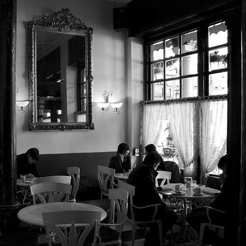 La pareja se tomó cada uno su café, pagaron tres cafés, tomaron dos, y se fueron. Luego pasó un grupo de cuatro personas, tomaron cuatro cafés, los pagaron y se fueron; luego pasaron cinco personas, pidieron siete cafés, cinco para tomar y dos en suspenso, se tomaron sus cinco cafés, pagaron siete y se fueron.