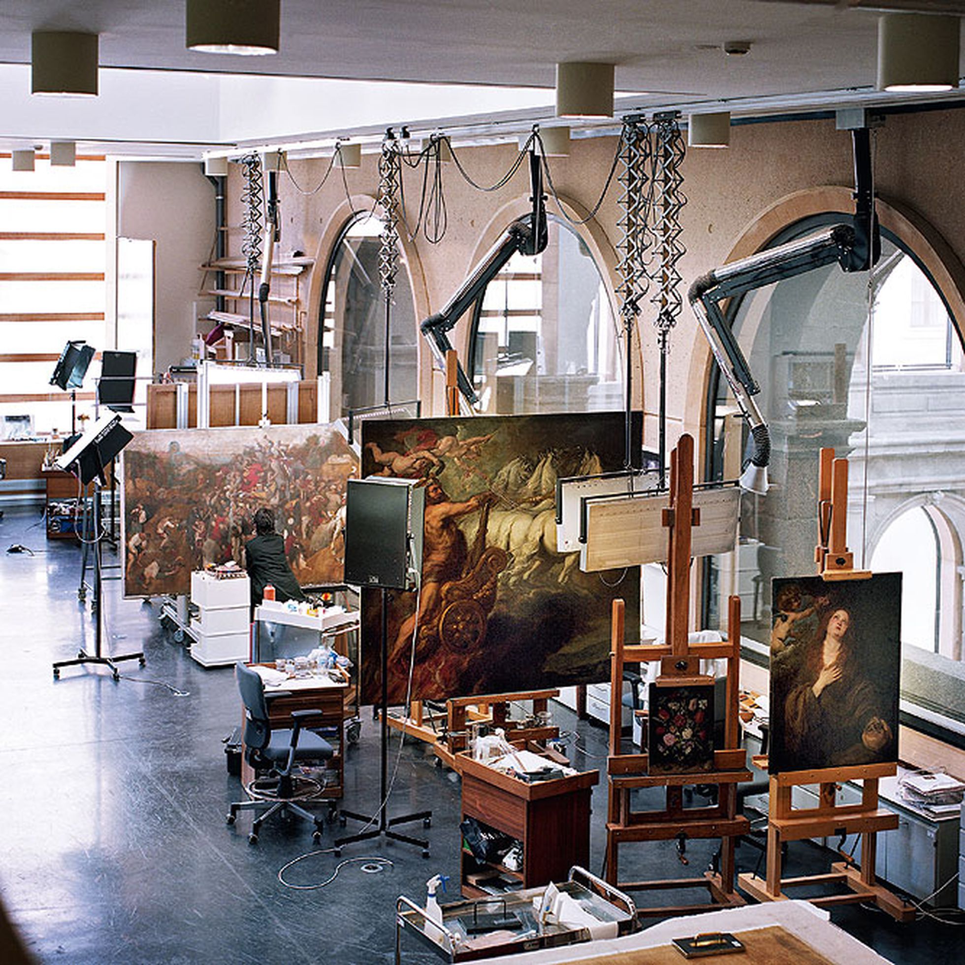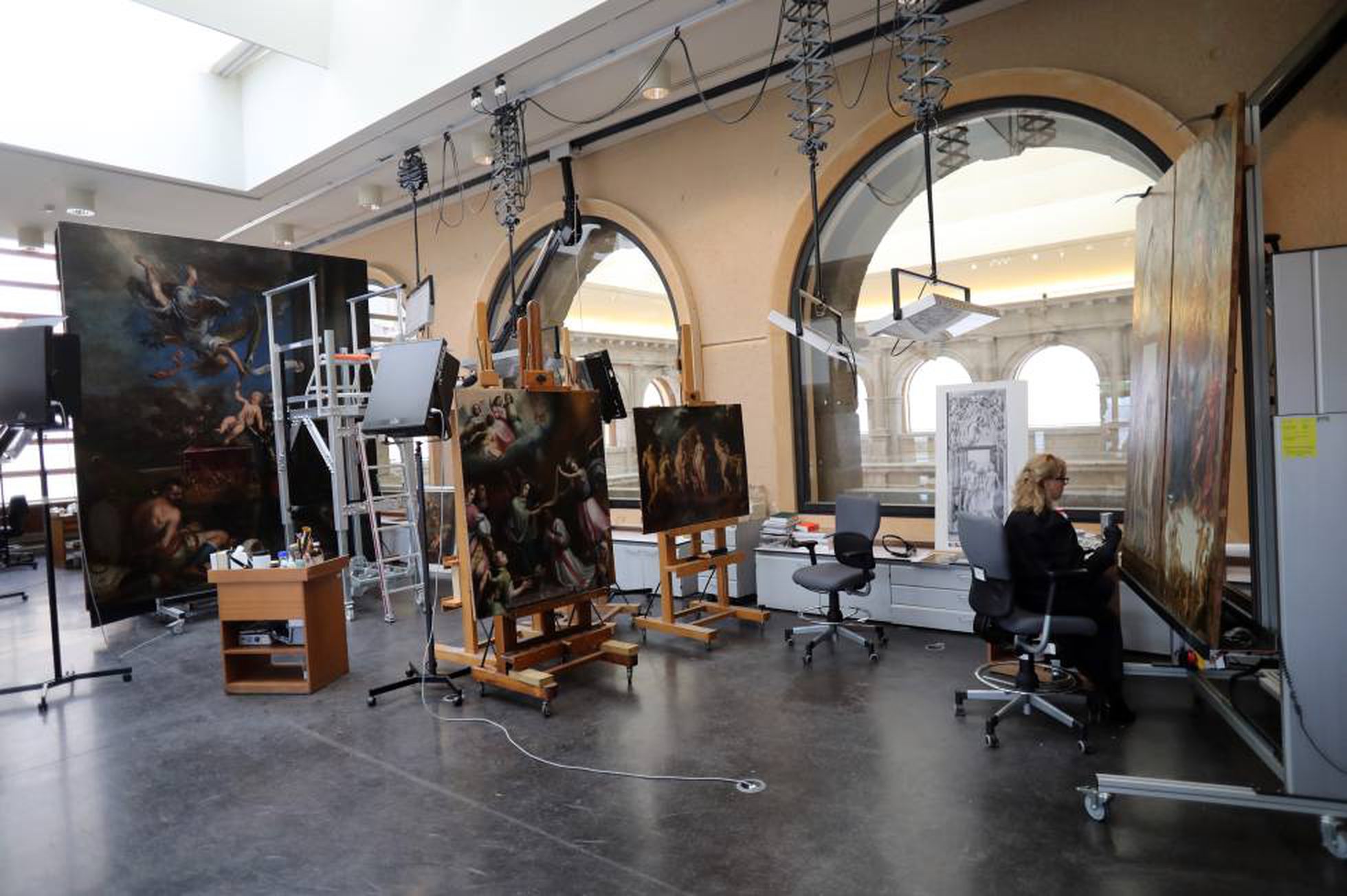 Sin duda fue por cuanto había visto durante muchos meses en televisión sobre las entrañas —llamémoslas así — de la pandemia que llevaba casi dos años asolando España y el resto del mundo, por lo que no me extrañó descubrir aquellos nuevos talleres del museo de la Mirada muy parecidos y casi vecinos a los talleres que existían anteriormente en el Prado, con sus departamentos acristalados y protegidos como ocurre en los hospitales, aislados, invadidos por sombras de batas blancas que iban y venían apresuradas y cuidadosas entre los cuerpos enfermos del arte para, en la medida en que ellos podían, y a veces podían mucho, conservarlos vivos y restaurarlos, tal y como yo los había visto el primer día cuando entré a ver la ampliación del Prado. El arquitecto argentino César Pelli no sólo había permitido dejarse influir por el edificio Sabatini para trazar su insólito claustro de velas iluminadas y rostros de flores asomando por las ventanas desde el cercano Botánico , sino que también se había aprovechado de algún modo de las ideas y dimensiones que el arquitecto español Rafael Moneo en 2007 había aplicado en su momento para establecer espacios e instalaciones que unificaran talleres de conservación de pintura y escultura, gabinetes de análisis de dibujos y recintos especialmente blindados para guardar y proteger determinadas obras.