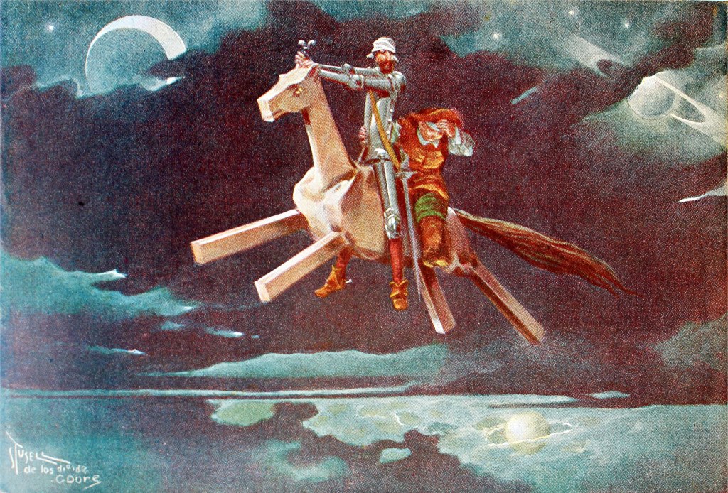Recuerdo el ruido de.los libros. Yo me había quedado a oscuras a propósito en el centro de la biblioteca, en el centro la habitación, sin toser, sin moverme, los pies juntos, inmóvil. De repente apareció don Quijote apartando con su lanza la cortina de los clásicos,allí, en el rincón de Quevedo y de Manrique. Apartó la cortina con la lanza y evitó que Rocinante diera un pequeño traspiés contra la madera de la balda, apenas nada, porque pronto se irguió su figura y con Sancho detrás en la grupa avanzó por entre los lomos de los libros y los cristales de las estanterías porque iban los dos en busca de Papá Goriot, que estaba cenando con Balzac en la balda de los franceses entre una nube de café humeante, tazas y tazas de café humeante cuyas burbujas subían hasta el cerebro del novelista y le provocaban crear la Comedia Humana. Yo sabía que los personajes invadían la biblioteca del despacho y cada uno hablaba en su idioma y contaba sus hazañas, pero lo que no imaginaba era que cuando yo me iba a acostar los personajes salieran de sus estanterías como si se asomaran a un pueblo singular, a la gran plaza de un pueblo literario, en donde se