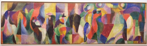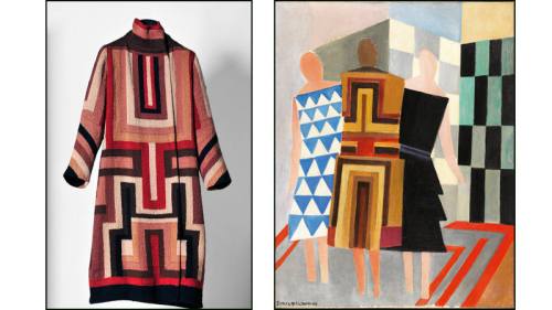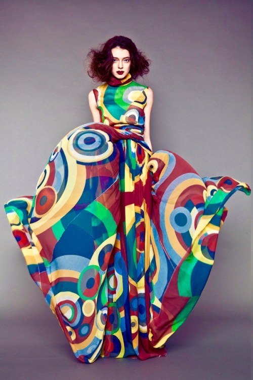 Ahora en el  museo Thyssen de Madrid tiene lugar la exposición «Sonia Delaunay. Arte, diseño y moda». En el Madrid de «Pombo» y del «ultraísmo» –  lo quiso recordar James Laver en su » Historia del  traje»-, » Sonia Delaunay es acogida con adoración. En ese ambiente se dedica al diseño de trajes y a la decoración. No era esta su primera incursión en este campo porque en 1913 ya había realizado su primer «vestido simultáneo«, pero sólo ahora se dedica de lleno a la aplicación de los principios del «orfismo» al tejido. Serge Diaghilev, que hacía entonces una gira por España con los Ballets Rusos, le encarga los trajes para » Cleopatra» y le pone en contacto con el marqués de Valdeiglesias, quien le introduce en la buena sociedad madrileña para la que realizará trajes y decoraciones. Sonia Delaunay abre una  «boutique» que tiene un enorme éxito, y pronto su moda se extiende a Bilbao y San Sebastián. Sus creaciones en el mundo de la moda suponen la primera aplicación de la abstracción en el traje y son viables gracias al respaldo que encuentra en la élite aristocrática española. Sus obras carecieron entonces de repercusión fuera de esos círculos y hubo de esperar hasta los años 60 para que Sonia Delaunay fuera descubierta».