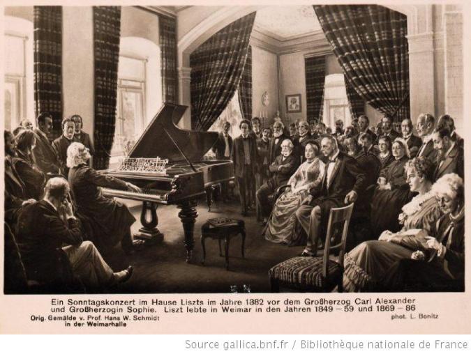 (Imágenes:- 1.-concierto dominical en casa de Liszt en 1882 ante los grandes duques Carlos Alejandro y Sofía.-wikipedia/2.-Franz Liszt en los últimos meses de su vida.-foto Nadar.-wikipedia)